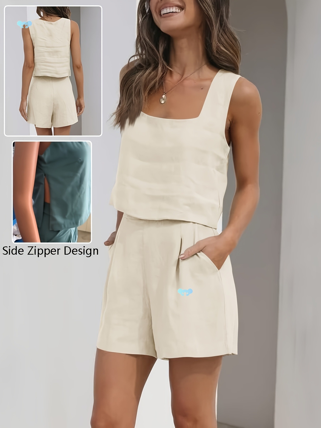 サマースリーブショーツスーツファッションスクエアネックベストトップ