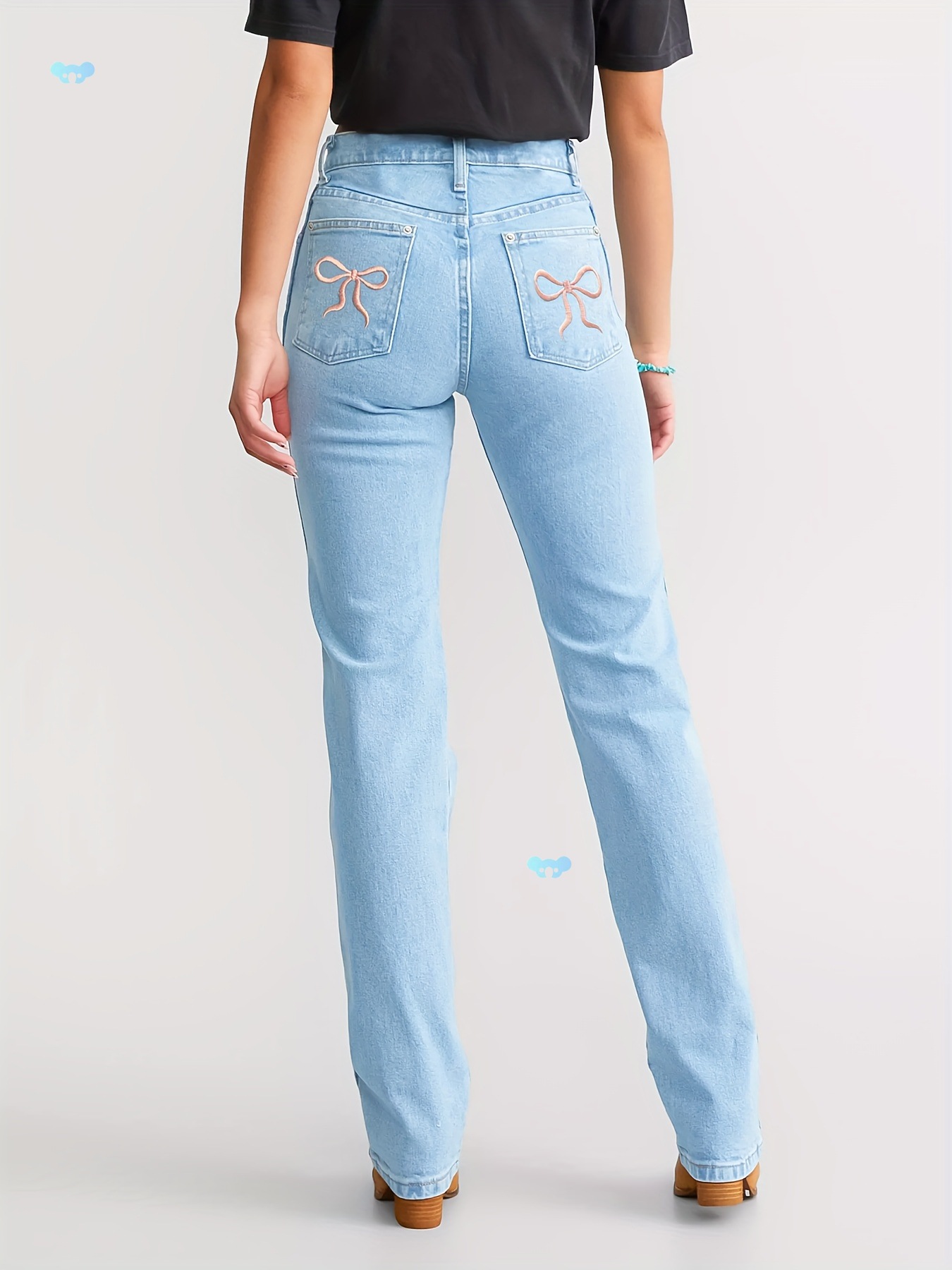 女性のストレートレッグデニムパンツ、刺繍入りリボンライト付き