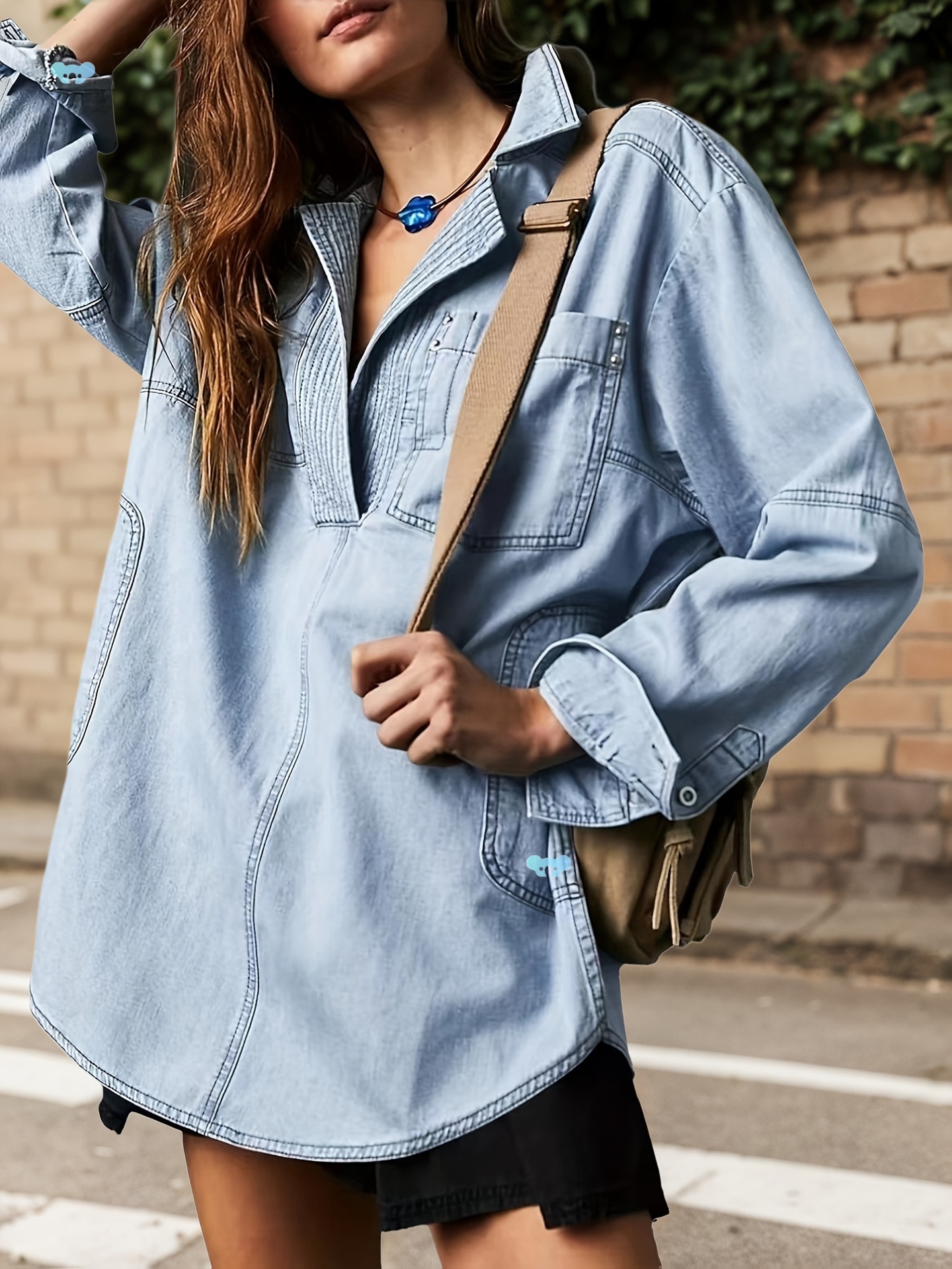 レディースカジュアルフェイクデニムジャケットトレンディなダメージ加工ボタンアップ