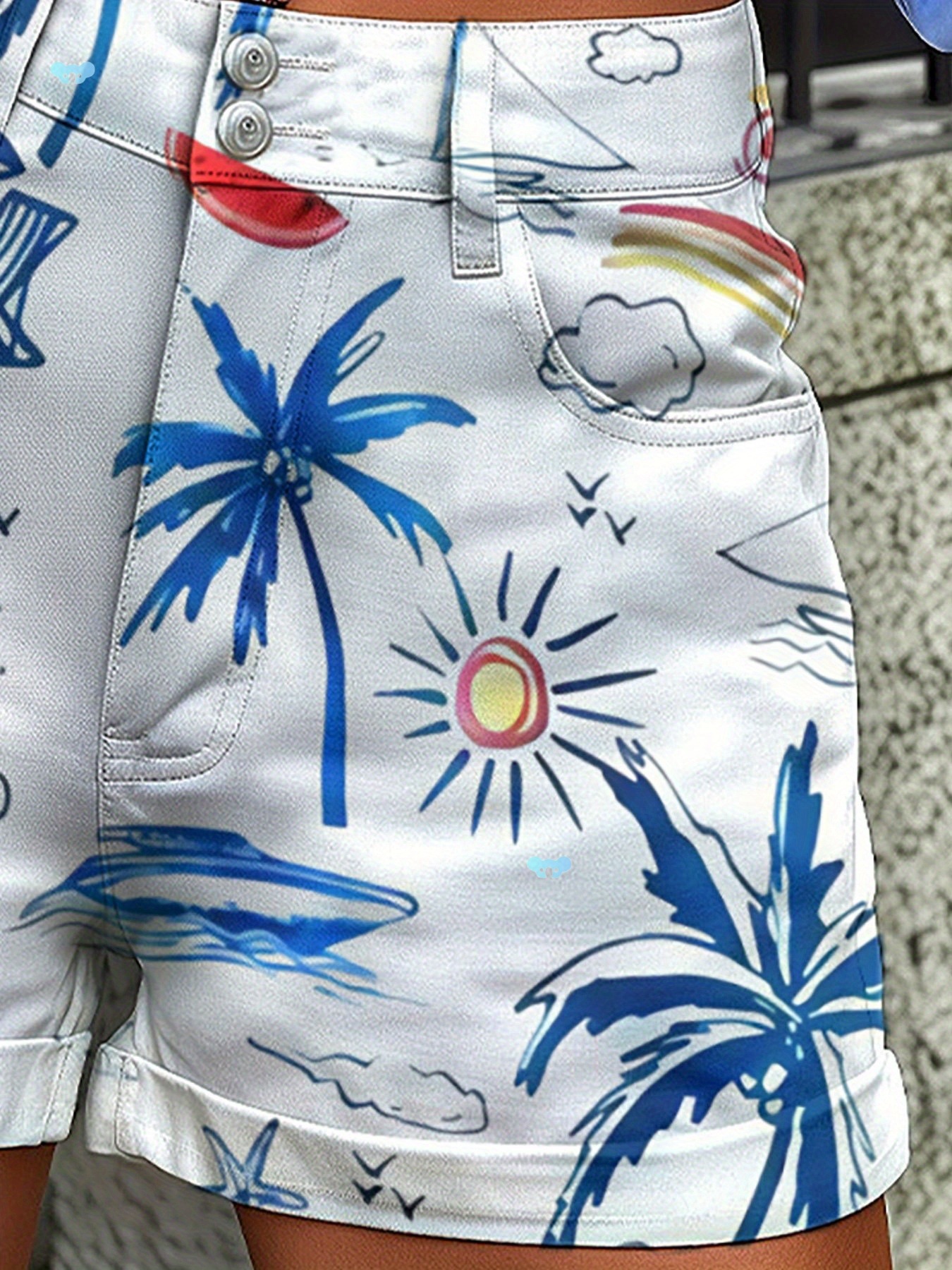 ハワイアン プリント トロピカル パーム ツリー付きレディース デニム ショート パンツ