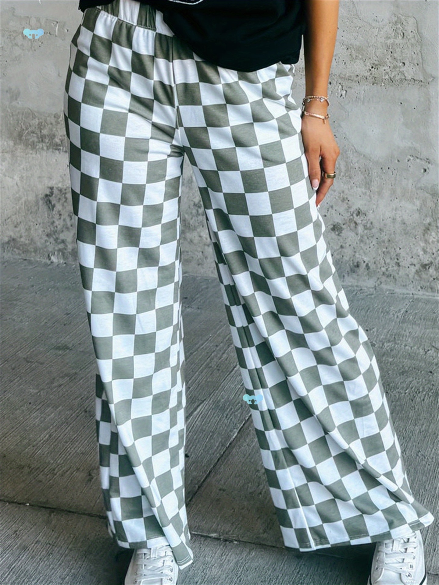 レディース チェッカーボード ワイドレッグ パンツ ウエストゴム ピンク グリーン