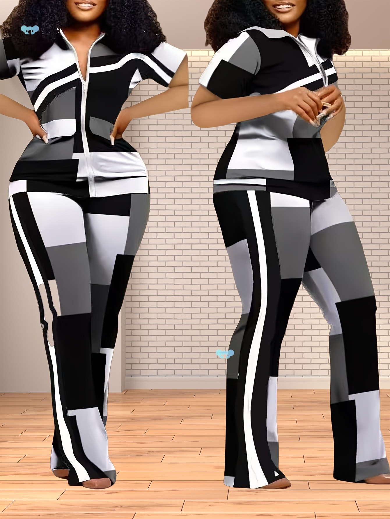 2 個ジオプリントトラックスーツセット女性ジップアップ半袖クロスボーダー