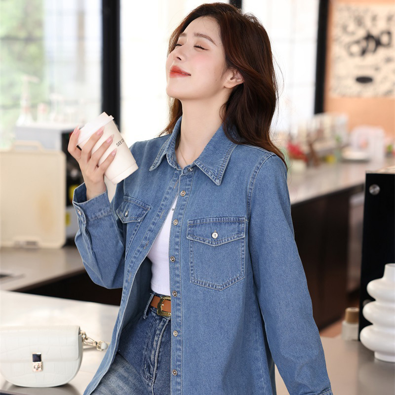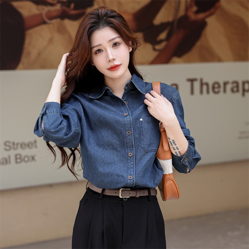 実際にレトロなデニムのシャツを撮ります。女性2024秋の新しい高級感のあるレトロな上着は青いシャツを重ねて着ます。