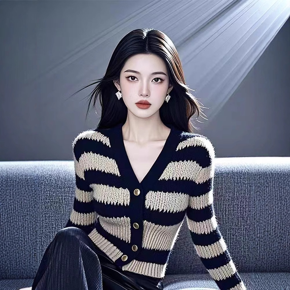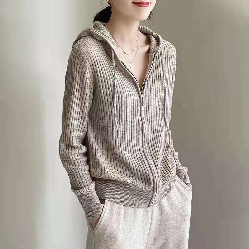 流行減齢フード付きニットカーディガン2024秋装新デザイン感ゆるいジッパーカジュアルストライプ上着潮