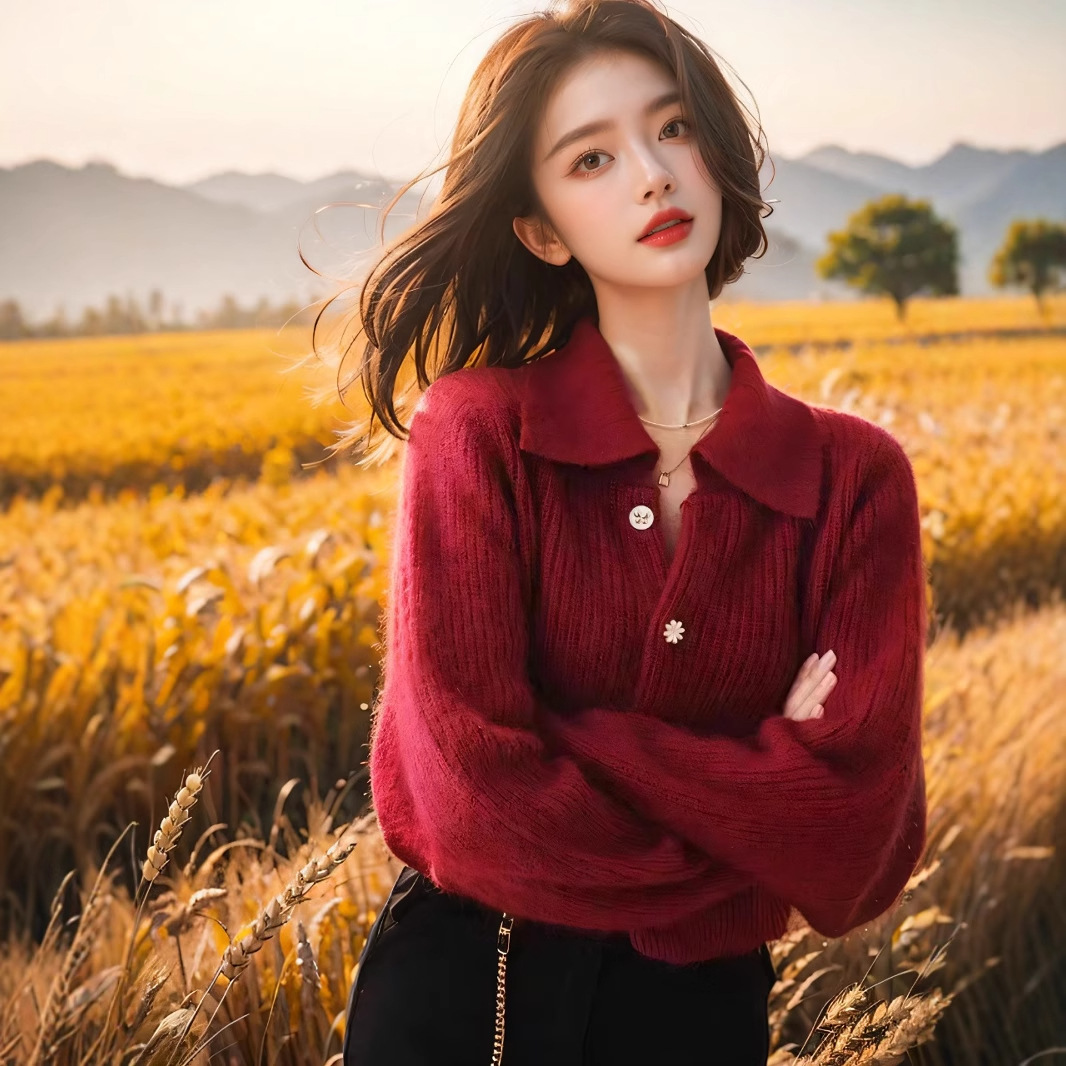 優しい風が柔らかいモチモチとした赤いpolo襟の女性春秋小香風セーターの外に短いニットの赤いカーディガンを着ています。