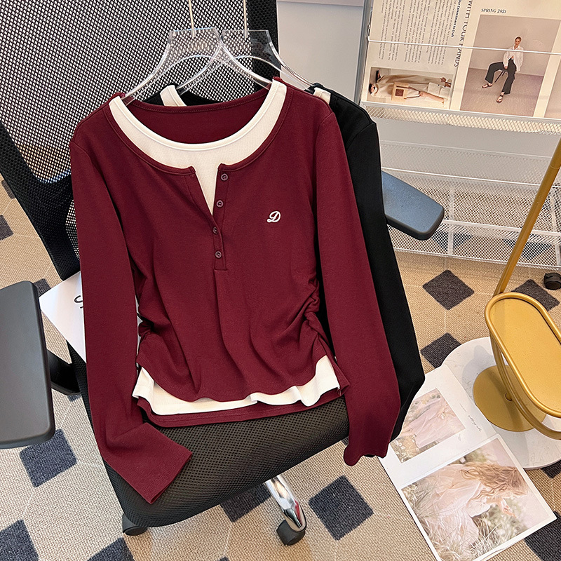 底のシャツの2024秋の新型の偽の2つの色の長袖のtシャツの女性の小さい人は腰を収めて丸首の上着を合わせます。