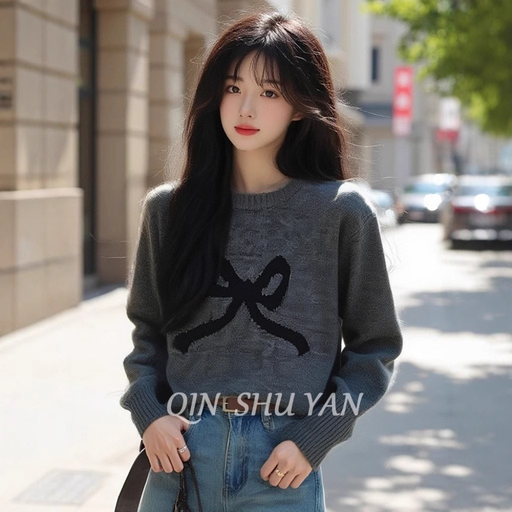 フレンチファッションの蝶結びの花の短いニットのセーターの女性の秋冬の新型の修身はやせています。