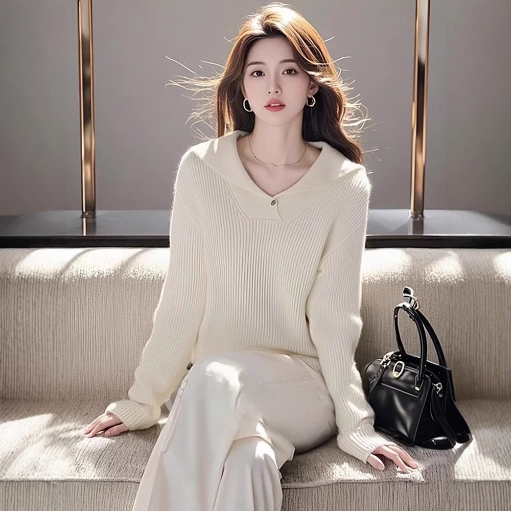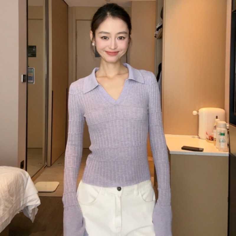 韓系筋理分割修身vネックニット襟ラッパ長袖女性新型上着