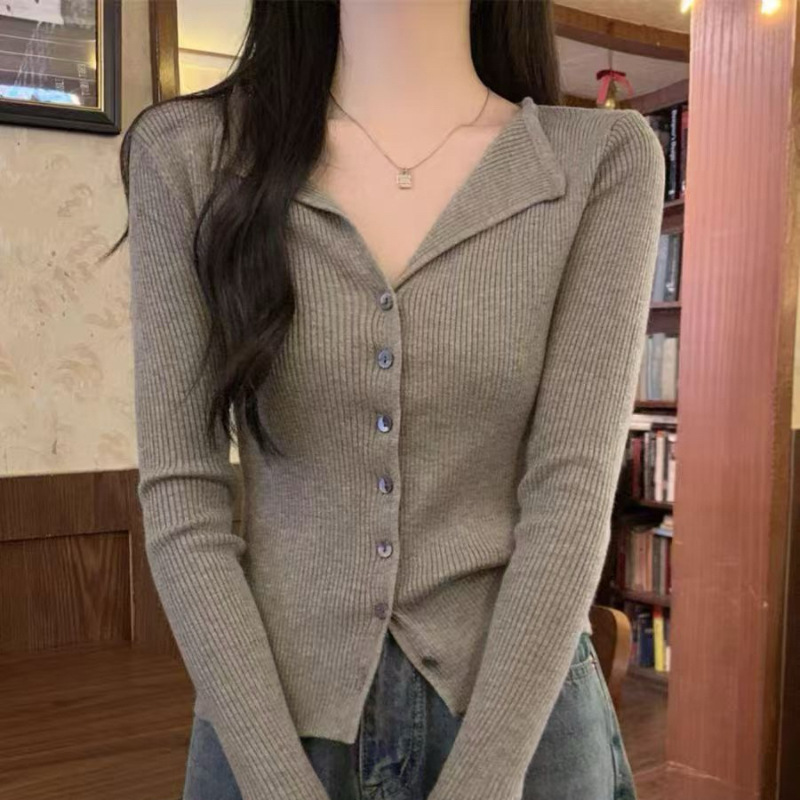 ニットのカーディガンの女性2024の新型の早春と秋の修身は襟の気質の中で底のセーターの短いvネックの上着を掛けます。