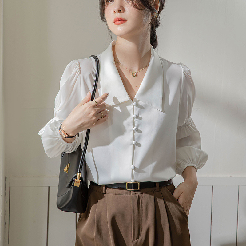 灯籠袖の白いシャツの女性春と秋のデザイン感があります。