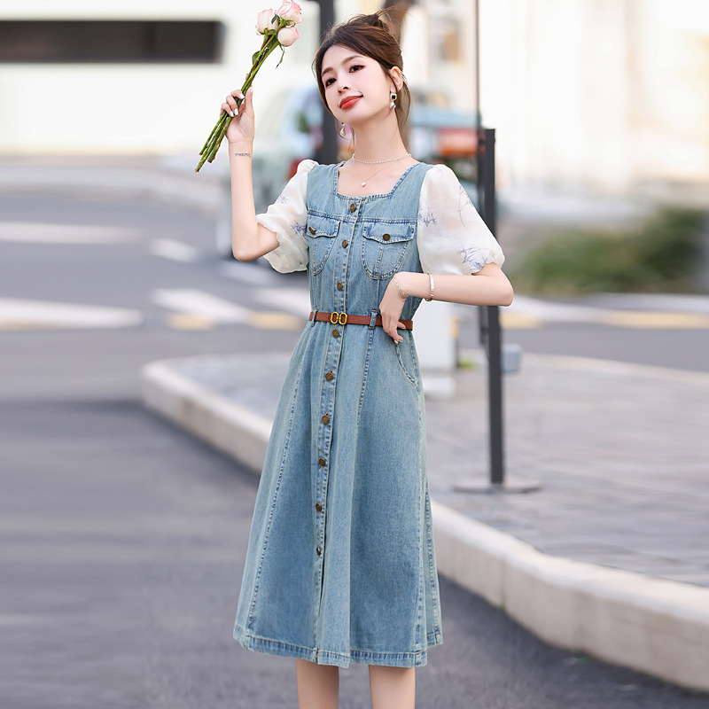 韓国版の中の長いタイプの水洗いデニムのワンピースの女性2024夏の新型の方襟は泡の袖のワンピースをつなぎ合わせます。
