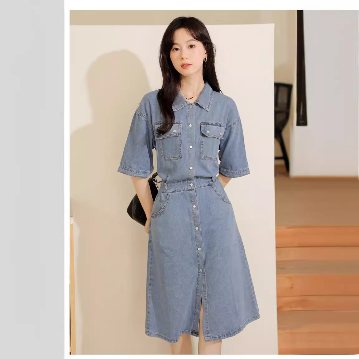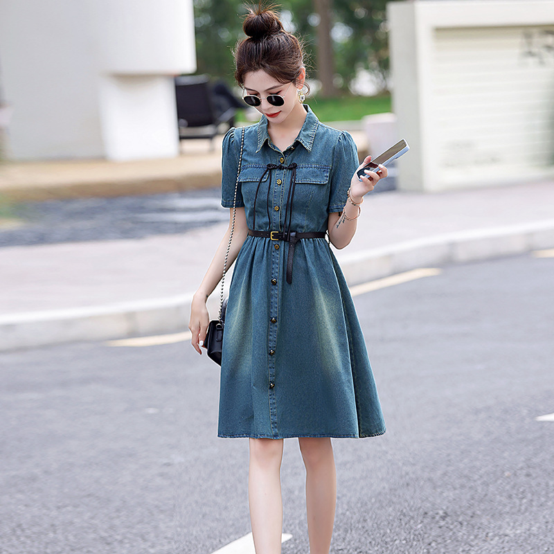 レトロな腰のデニムのワンピース2024夏のお茶の休憩のフランスの質感の中で袖のシャツのスカートのデニムのワンピース