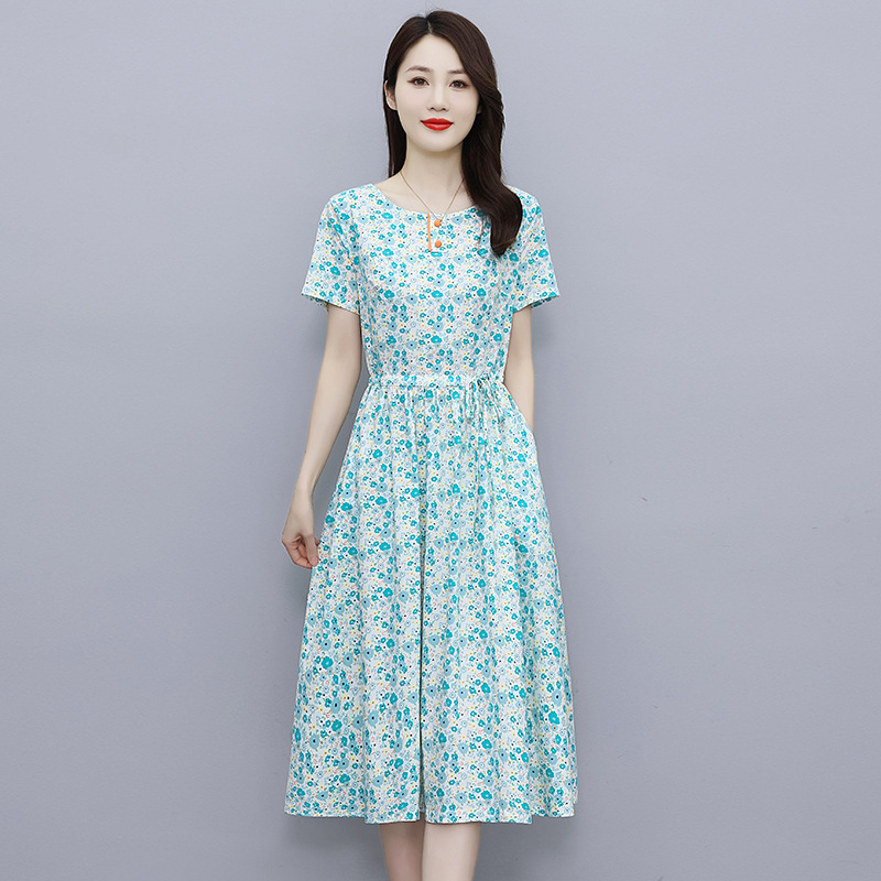 綿麻半袖ワンピース2024夏に腰を収めて痩せたファッション気質の甘いプリント中年ママスカート