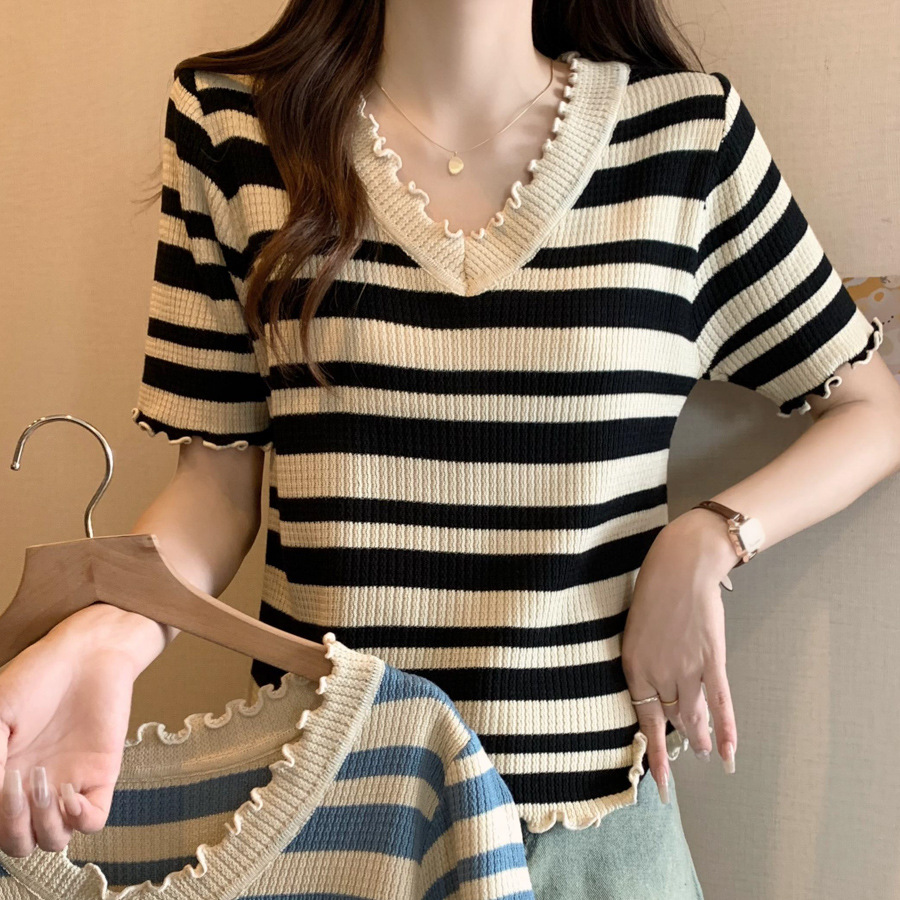 2024夏の新型波辺vネックニット薄手アイス半袖ニットシャツ夏tシャツ上着