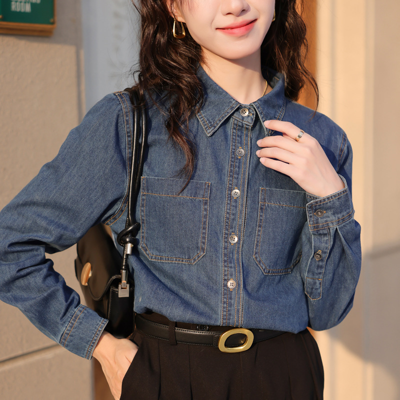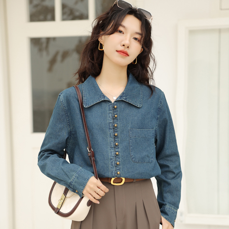 レトロな紺色の柔らかいデニムのシャツの女性は巻きません。