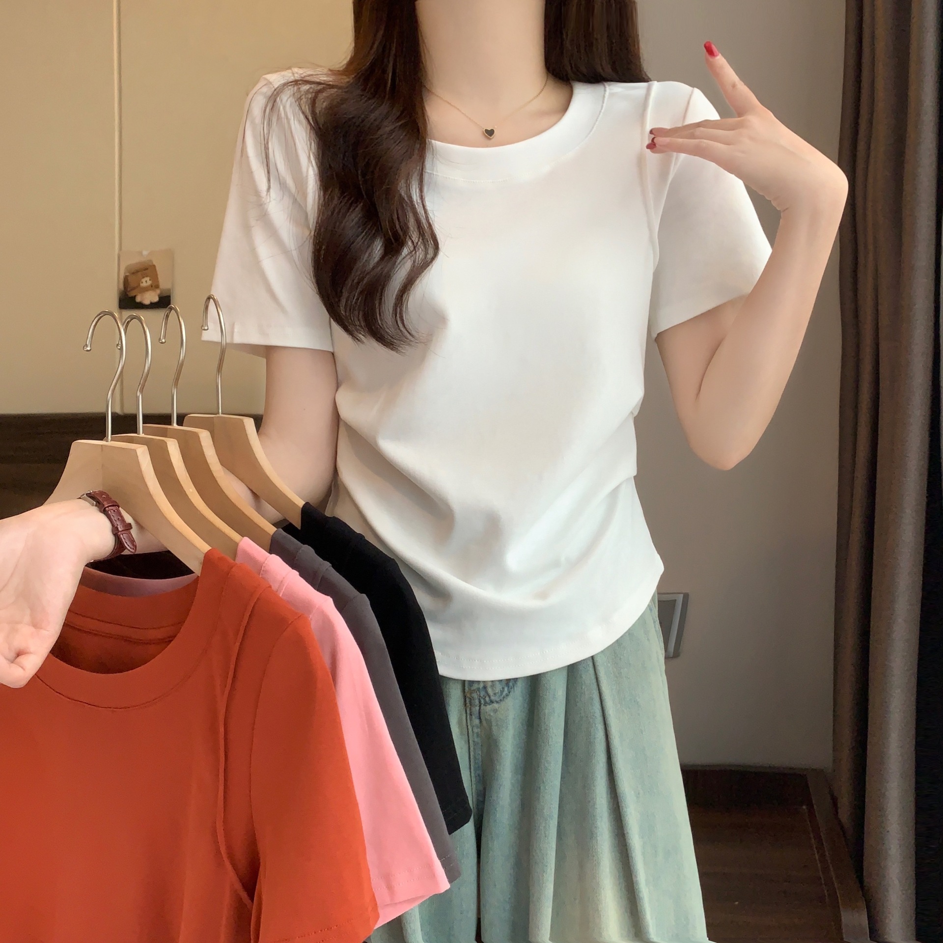 太ったmmの大きいサイズの婦人服の夏のtシャツの新型の2024百組のカジュアルな純色の修身はやせている半袖のtシャツの上着を現します。