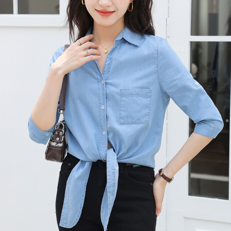 垂感七分袖vネックシャツ女性2024夏は痩せてカジュアルな薄い裾にデニムシャツの上着を結びます。