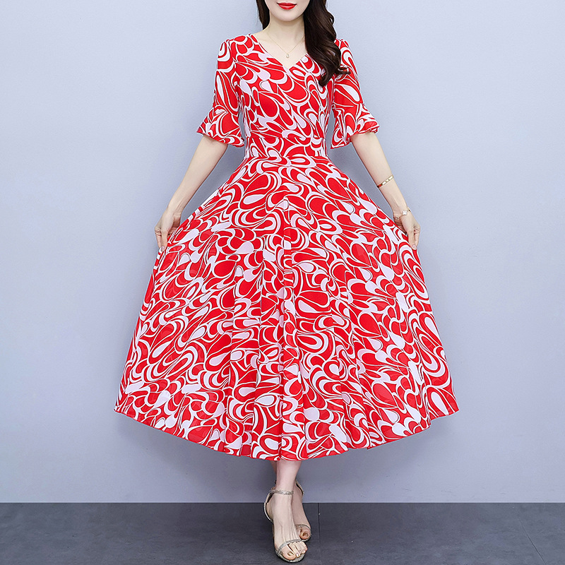 2024夏の新型vネック雪紡織ワンピース高級で痩せた気質の長いスカートが大きく伸びている中年ビーチスカート