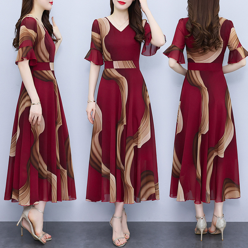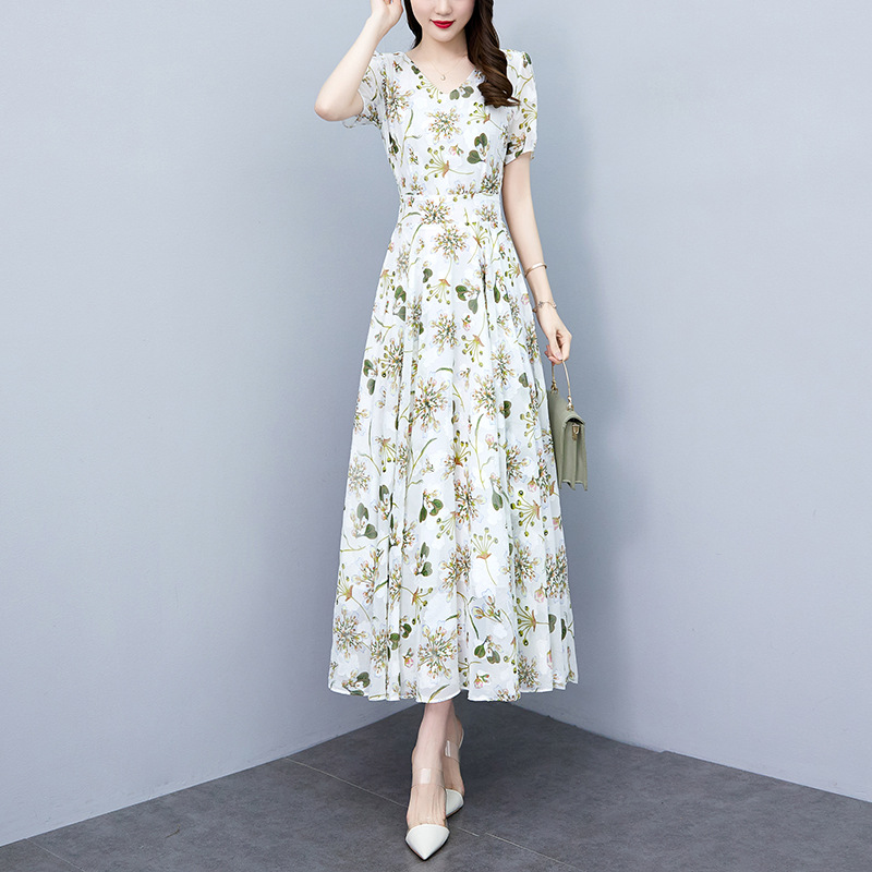 新型の婦人服2023夏のシフォンの花のワンピースのファッション的な気質は腰を収めてやせている大きいサイズの婦人服のワンピースを現します。