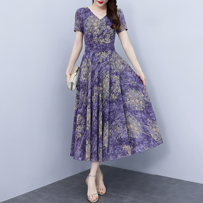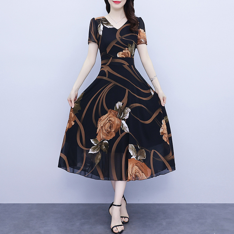 シフォンの花のワンピース2023夏の新型の大きいサイズの婦人服の太ったmmは腰を収めてやせて見えます。
