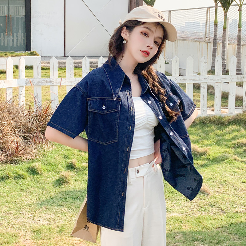 デザイン感のある半袖の薄いデニムの上着のシャツの夏の2023年の新型の女性の韓国版の半袖のシャツの女性