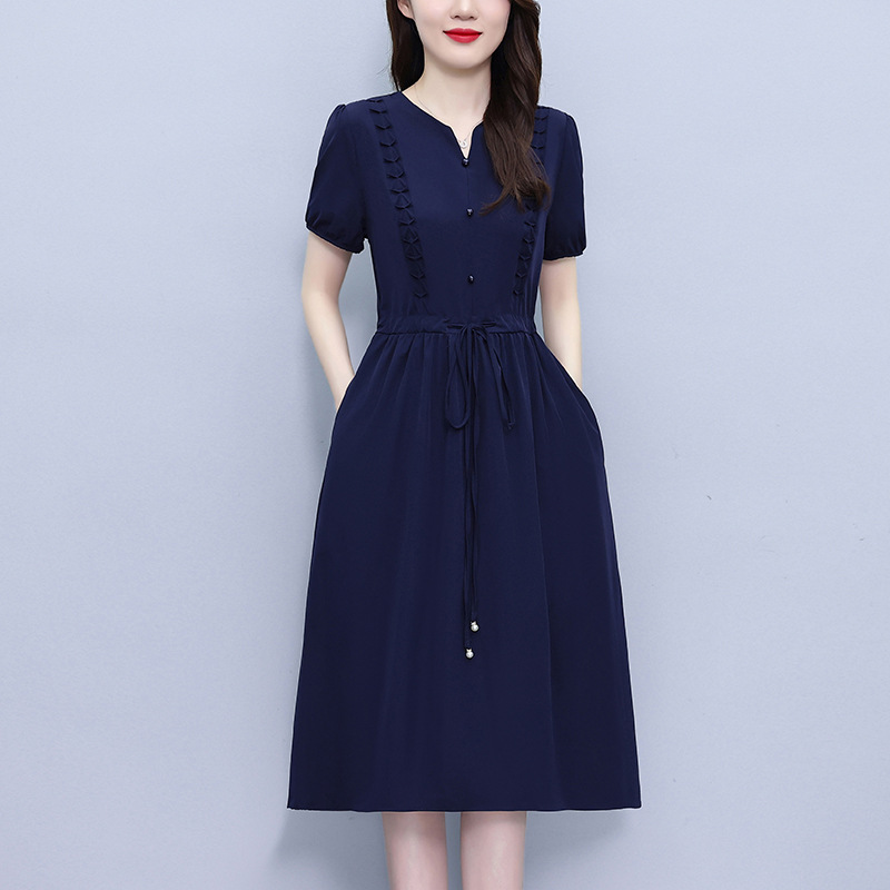 ポケット付き単層不透明新作ウエストゴムレーヨン麻防シワ洋風膝上ミドル丈半袖ワンピース