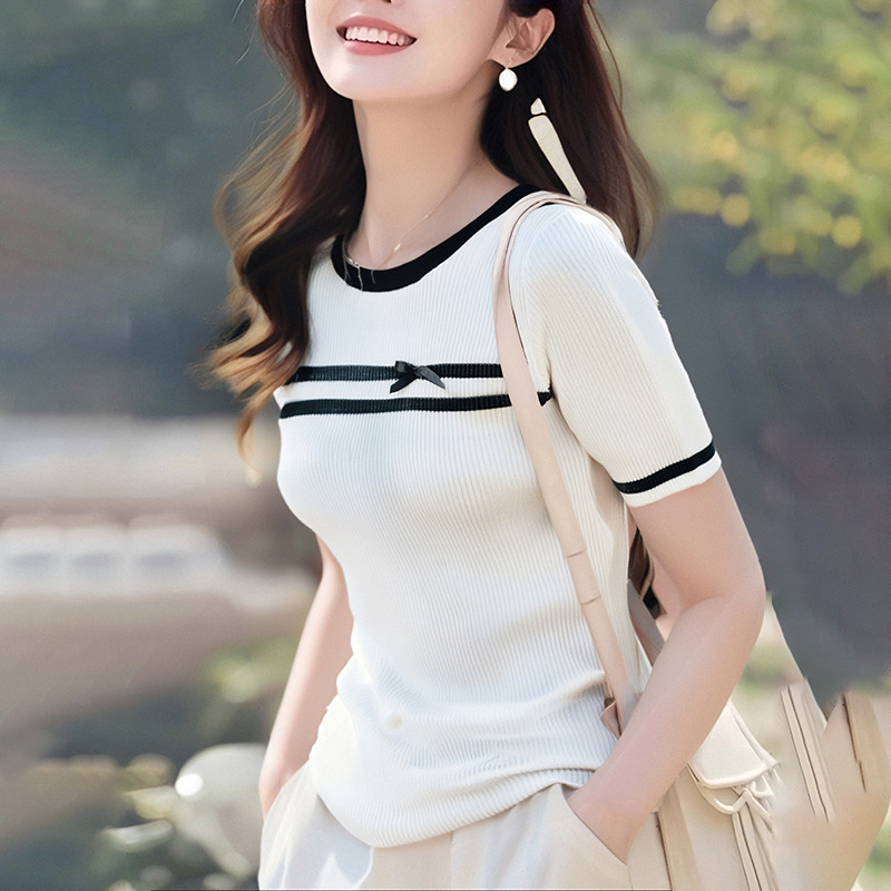 2025夏 小香風コントラストカラーリボンニットショルダーTシャツ