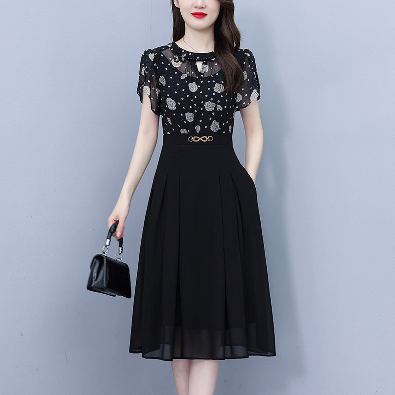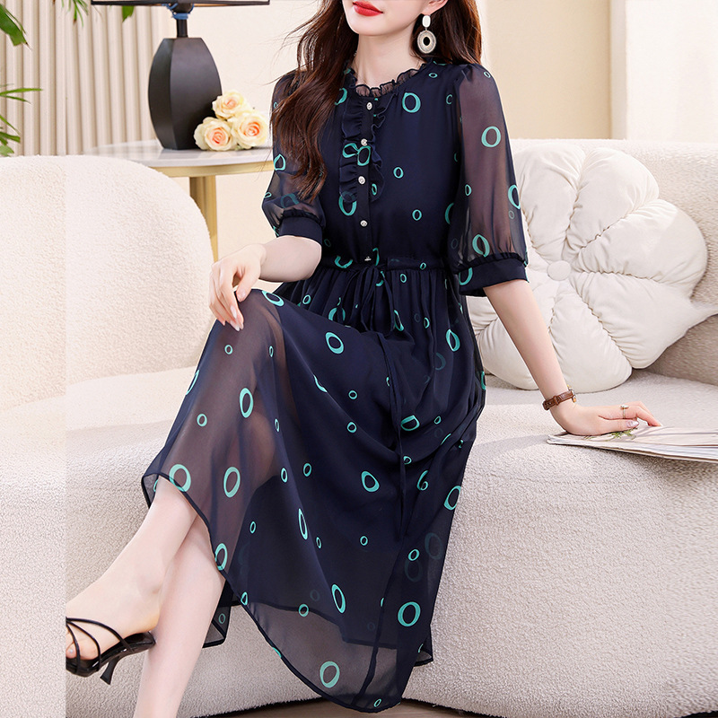2025夏半袖ガラスシルクシフォンプリントラージUネックウエスト痩身ドレスミドル丈