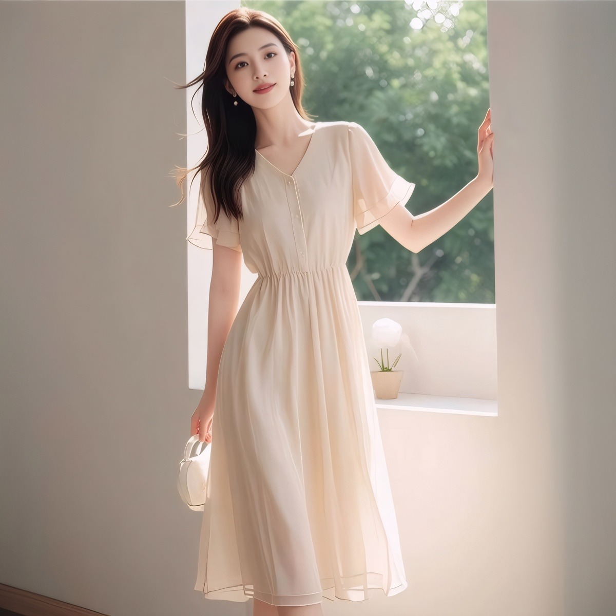 2025 新しい夏のスタイルシンプルな大きなフレンチスタイル美しい V ネックシフォンドレスフリルスリーブミドル丈スカート女性のための