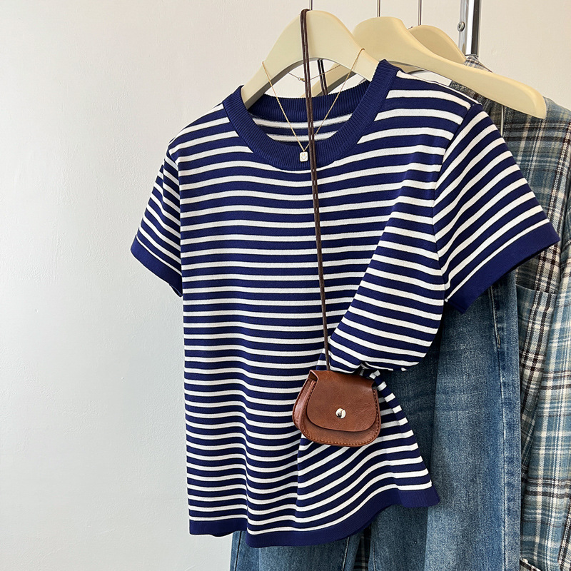 とても美しい!年齢軽減ハイエンドニッチコットンスパンコールガーゼテクスチャーストライプセーター右肩半袖Tレディーストップス春
