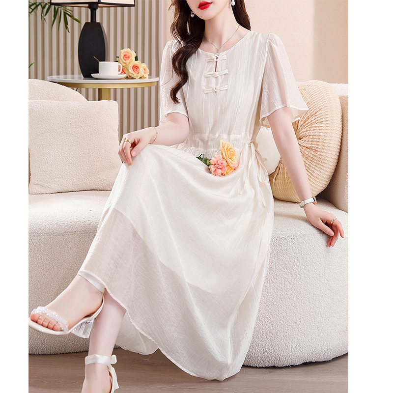 ポケット付きナノストリップバックル中国風ドレス2025年夏新作レースアップウエスト痩身気質