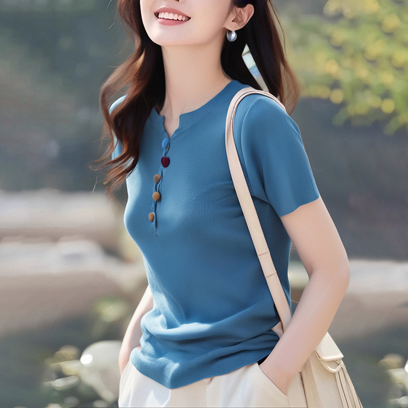 2025 夏カラフルなボタンハーフオープンカラーニットトップ女性用