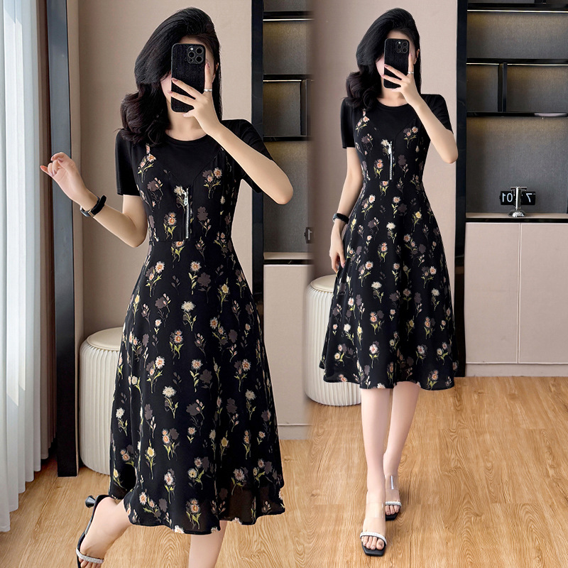 大きいサイズの婦人服のスカート2025夏の新型のプリントは偽の2枚の小さくて太っていて痩せているワンピースをつなぎ合わせます。