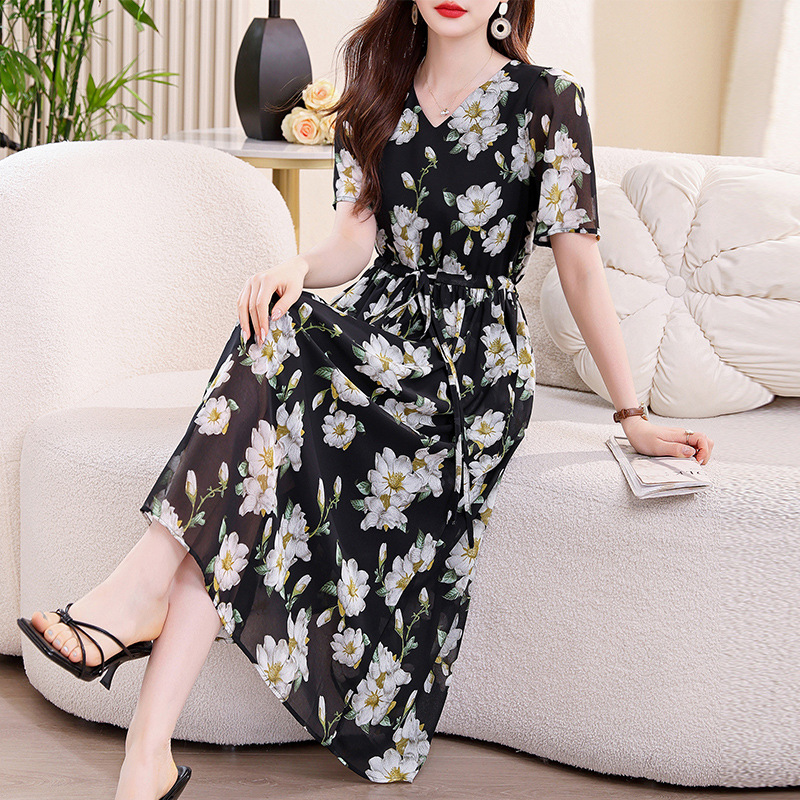 2025夏半袖ガラスシルクプリントVネックウエスト痩身ポケットドレスミドル丈