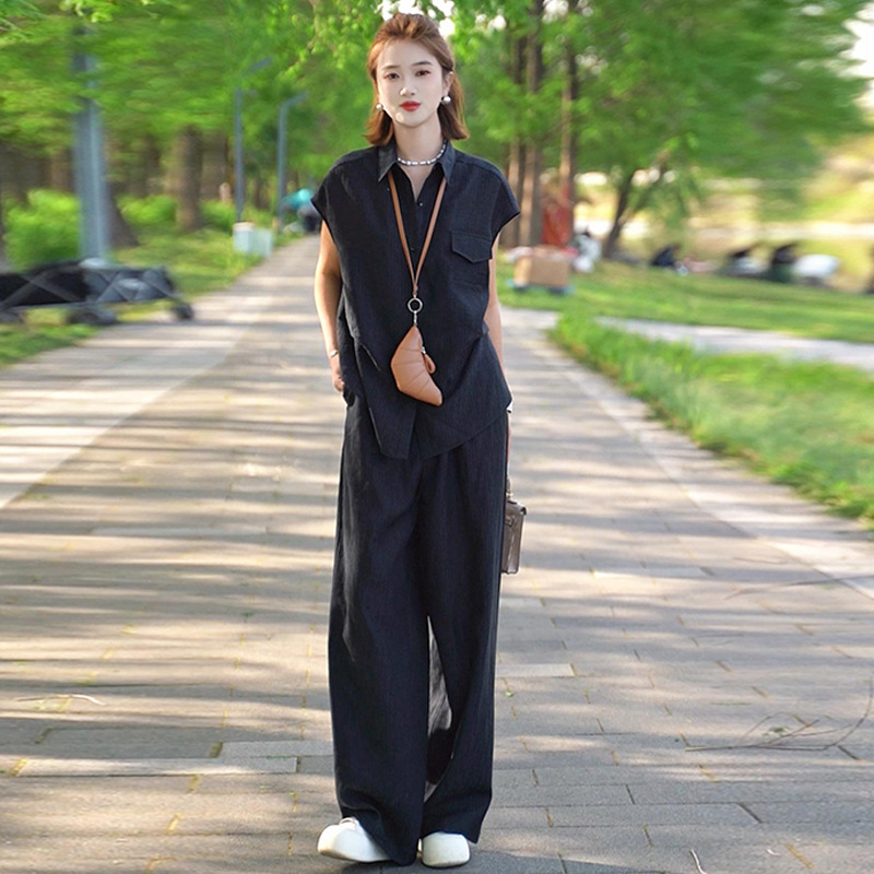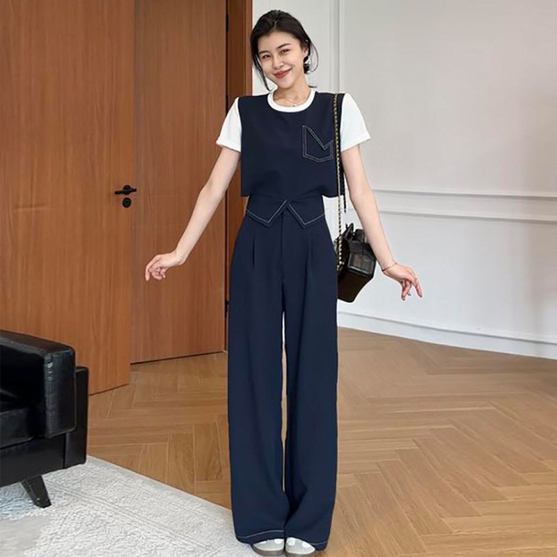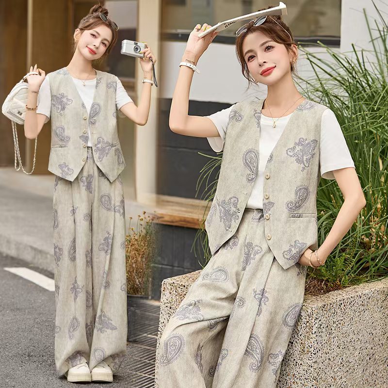 新しい中国風の女性用スーツ 2025 夏の新しいスタイルのコントラストプリント年齢を軽減するシングルブレスト気質ベスト + ワイドレッグパンツ