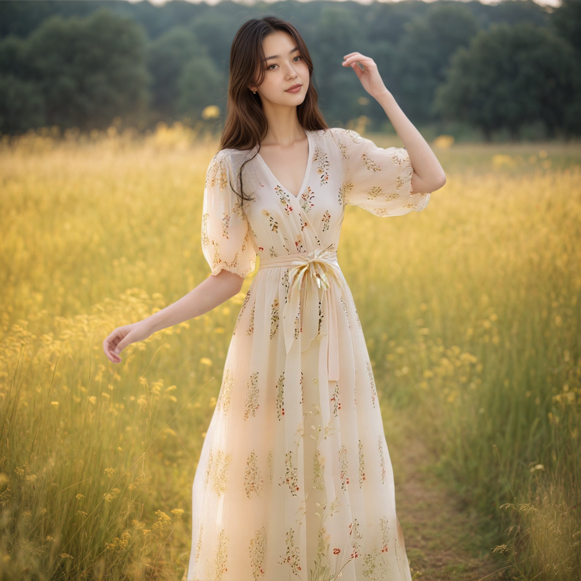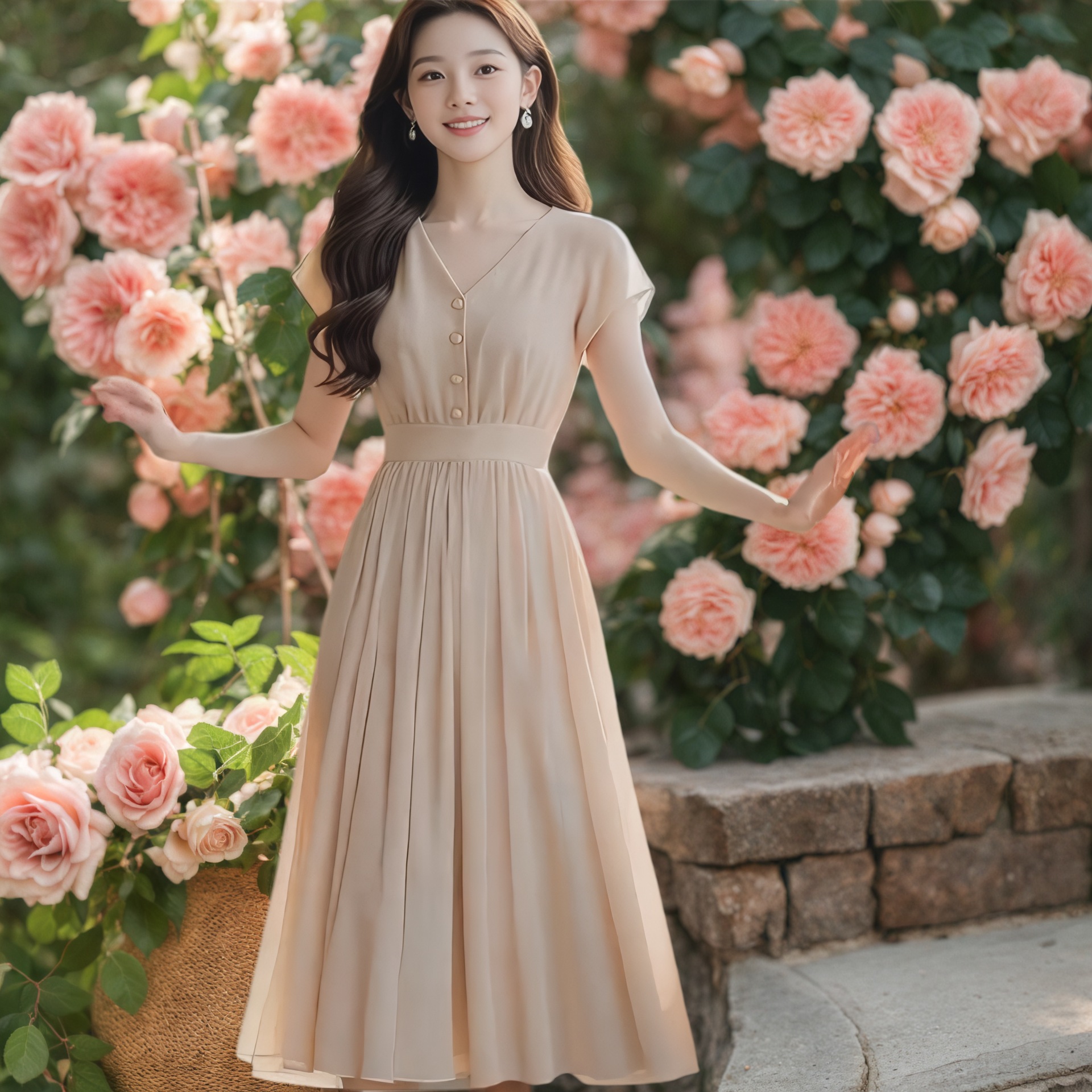 Vネック無地シフォンドレスレディース2025新作夏ウエスト気質ハイエンドライト大人スタイルミドル丈スカート