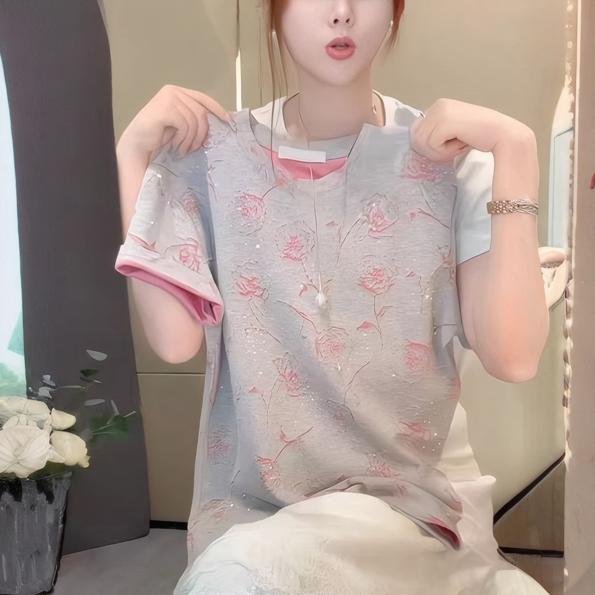 2025韓国版ニッチデザイン2色両面ラウンドネックスリムミディアム半袖スレッドカラー+裾上げTシャツ