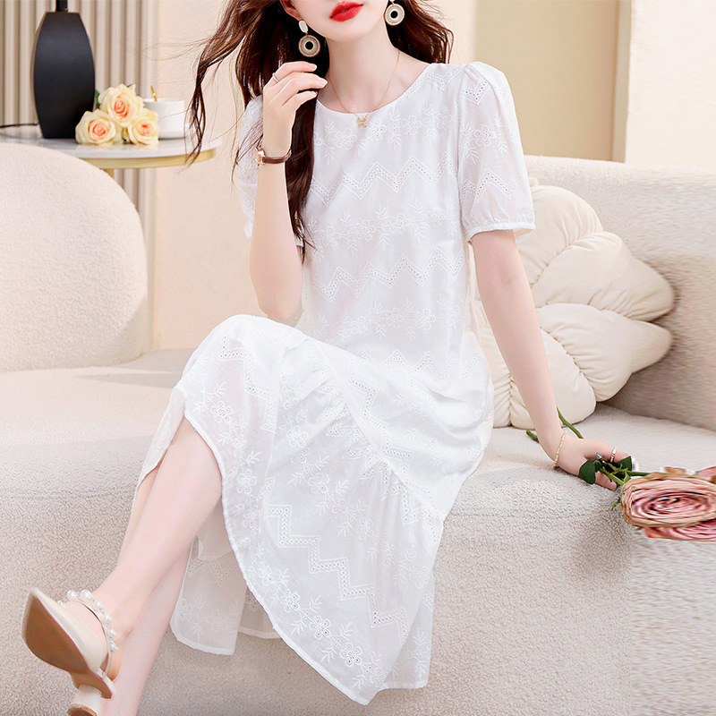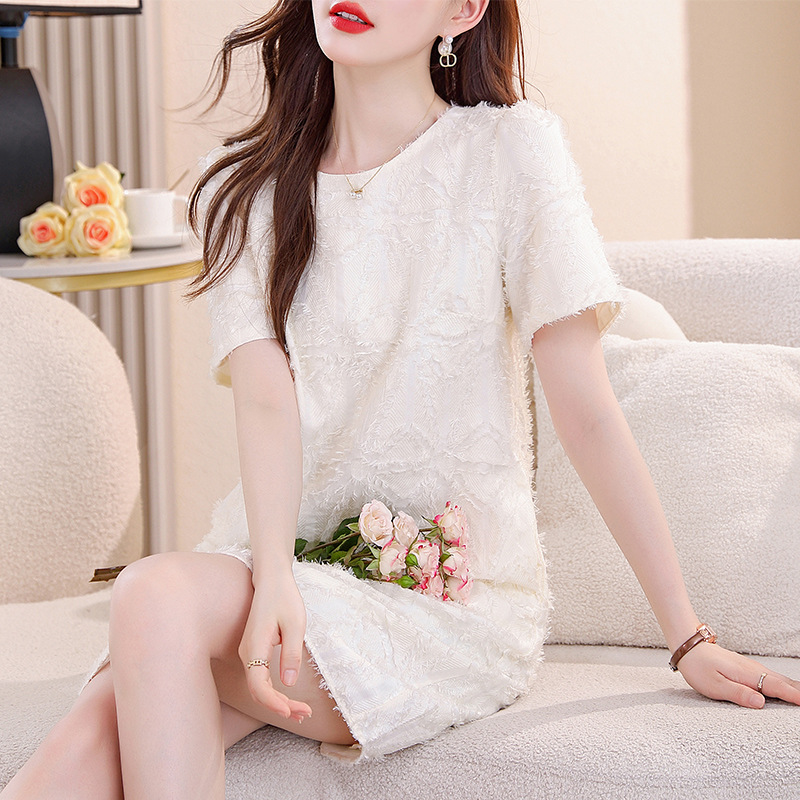 2025夏半袖シフォンジャカードカットアウトポケット付きゆったりお腹カバーワンピースミディスカート