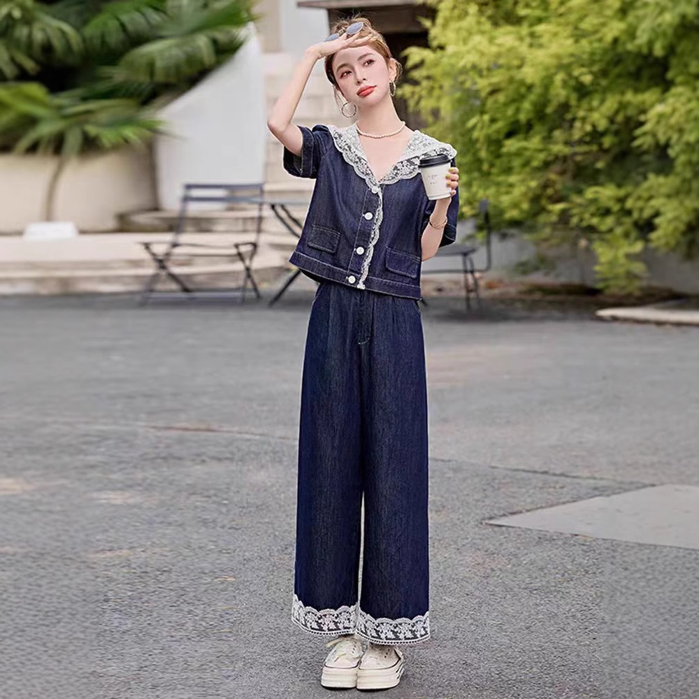 ヨーロッパの高級デニムスーツ女性の夏の新しい韓国スタイルの年齢を軽減する半袖トップジャケットワイドレッグパンツ 2 点セット