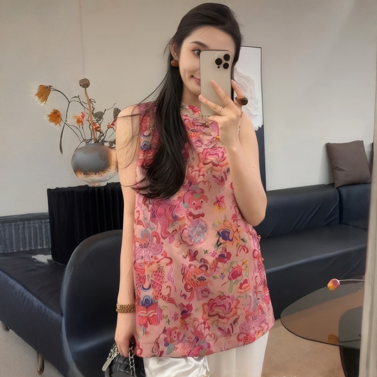 新しい中国風プリントサテンノースリーブシャツ女性のための 2025 夏の新しいレトロな中国風のデザインスタンドカラーベストトップ
