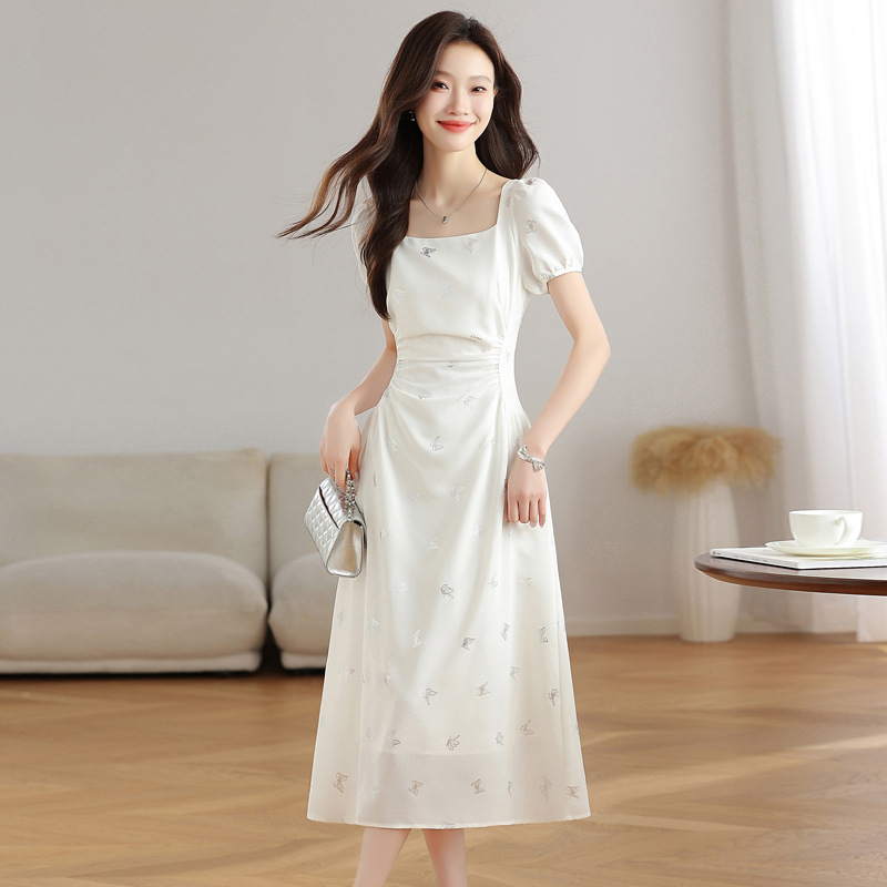 フレンチスクエアネックシルクサテンプリントドレス女性の夏の気質スリムウエストプリーツヒップカバー