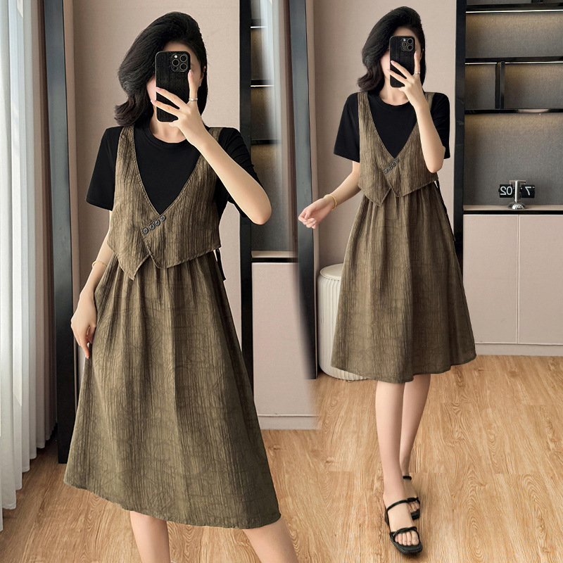 2025 新しい夏の韓国スタイルの大きいサイズのファッショナブルなテンセルステッチルーズ痩身偽ツーピースドレス