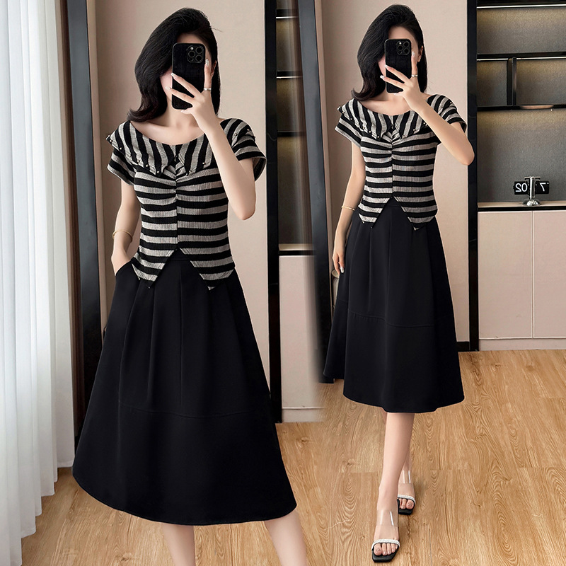 2025 夏の新ファッションスーツ大きいサイズの女性のスリムストライプトップスとスカート 2 点セット