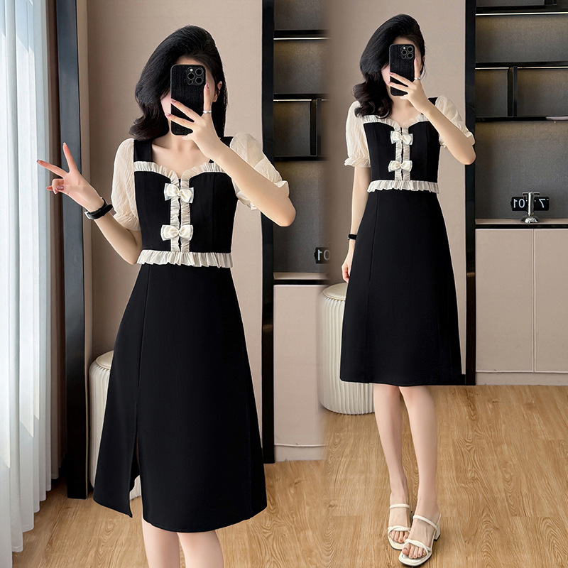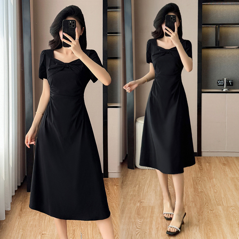 ヘボン風のフレンチカラーの黒いワンピース女性の夏の高級感はウエストの気質の中の長いスカートを収めます。