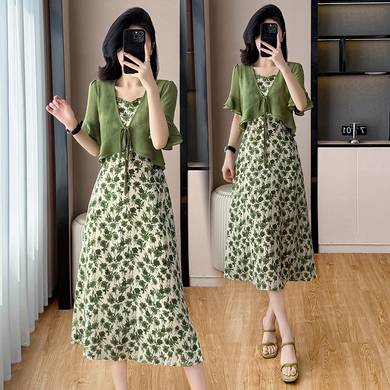 お嬢様気質の新しい夏スタイルのお腹カバー、着痩せ、おしゃれな中年ママの花柄シフォンドレス