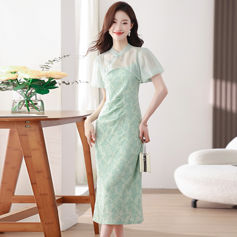 清平楽の花の紗のミントの曼波の風の新しい中国式の改良のチャイナドレスの風のブラウスのサスペンダーのスカート