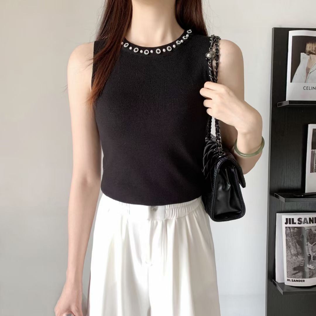 甘美なコンビネーションのベストの女性の中には、スリムなニットのキャミソールのノースリーブのシャツの上着を着ています。
