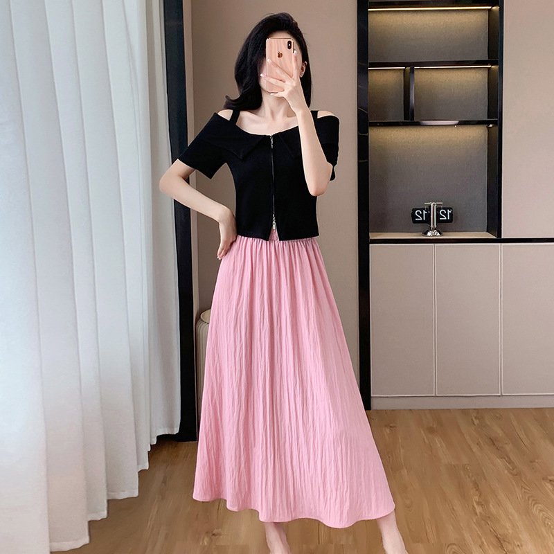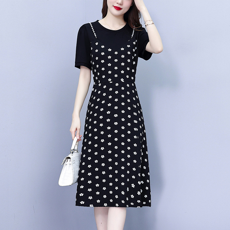 2025夏の新型の大きいサイズのワンピースの中で長い型のガーターは偽の2つの顕痩せのワンピースをつなぎ合わせます。