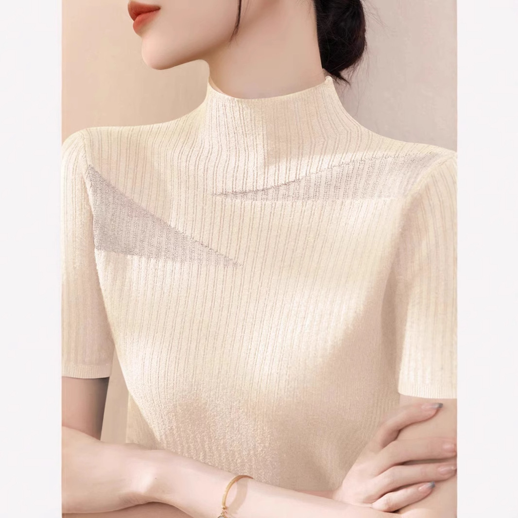 ニットシャツ2025夏の新型の薄いタイプの透かし彫りの半高襟の網糸レースの襟の半袖は女性の上着を修理します。
