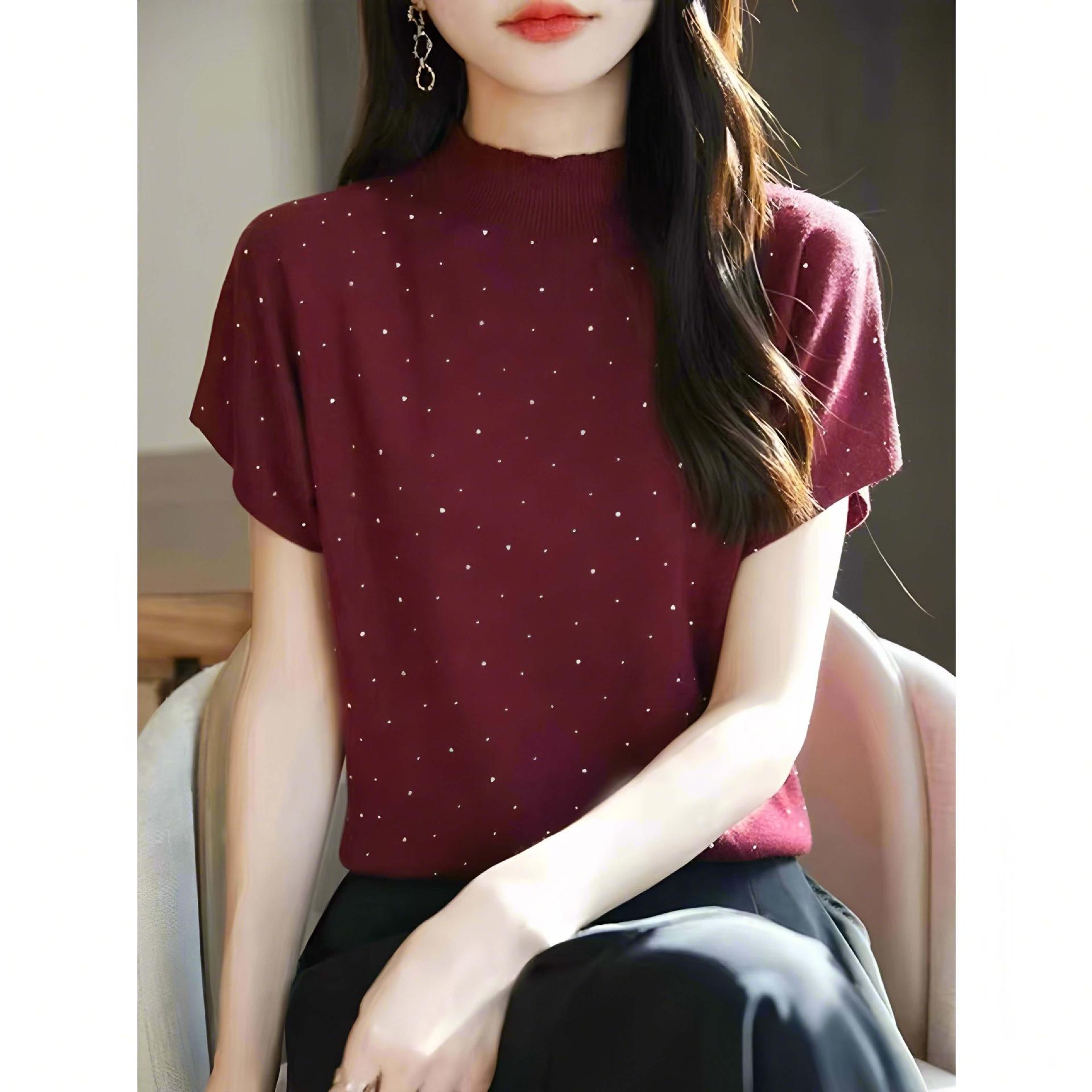 軽くて豪華な婦人服の韓国版の優雅な上着の2025夏の新型の半高襟の半袖の波の点の薄い金の百合のtシャツ
